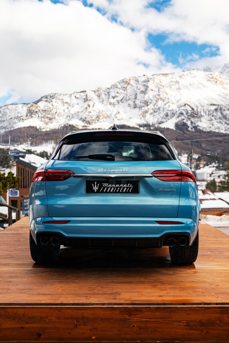 Elemento centrale dell’identità di Grecale Cristallo è l’esclusivo Azzurro Aureo, un colore Fuoriserie come certificato dalla livrea specifica sul parafango, badge e marchio di fabbrica del programma. Il naming racconta un percorso cromatico che parte dal blu Maserati e si evolve verso una tonalità sempre più pura e fredda, fino a schiarirsi ed evocare il bagliore sulla neve e sulle piste invernali. A questa base azzurra si unisce una mica dorata leggera, ma diffusa, che richiama il valore simbolico delle medaglie d’oro e interpreta i concetti di eccellenza, prestigio e vittoria in una chiave raffinata. L’estetica esterna è ulteriormente valorizzata dai cerchi in lega CRIO da 21” in alluminio diamantato e dagli inediti inserti della griglia anteriore verniciati nel colore della carrozzeria.