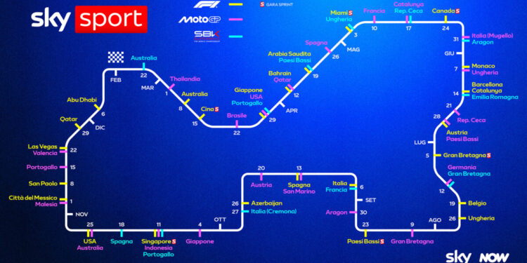 Saranno 11 mesi di spettacolo, con tutti i campionati della nuova stagione senza sosta fino a dicembre. Quasi finita l’attesa per la Formula 1, con le nuove monoposto che si mostreranno nel loro assetto definitivo nel week end dell’8 marzo ad Albert Park, in Australia, quando si scenderà in pista per il primo GP dell’anno. Saranno 24 le gare tra Europa, Asia, Oceania, Nord e Sud America, con il tradizionale finale di Abu Dhabi il 6 dicembre, che assegnerà i titoli piloti e costruttori. Appuntamento tricolore il week end del 6 settembre per il Gran Premio d’Italia a Monza, in diretta anche su TV8. Sempre live in chiaro anche le 6 Sprint di Cina, USA-Miami, Canada, Gran Bretagna, Olanda e Singapore, con le relative qualifiche. A Melbourne nuovo inizio anche per la Formula 2 (14 week end di gara) e per la Formula 3 (10 appuntamenti in totale), mentre bisognerà attendere Shanghai per l’esordio della F1 Academy (7 fine settimana). In primavera, invece, sarà la volta della Porsche Mobil 1 SuperCup (8 round totali).