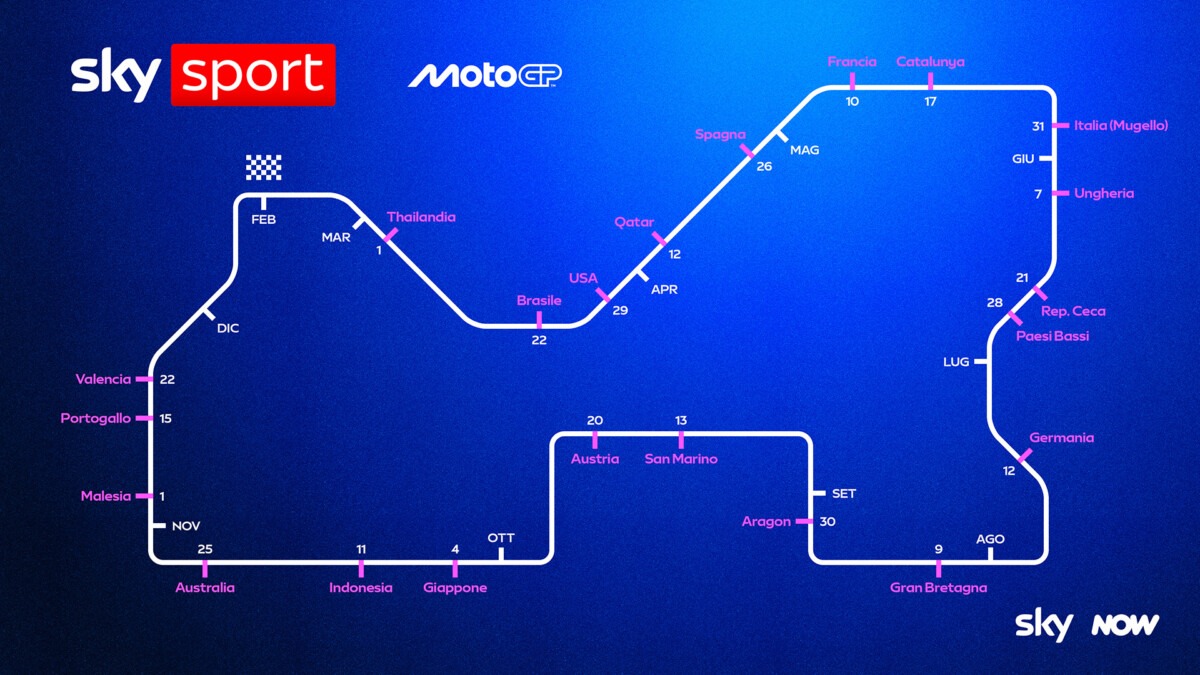 La prossima settimana parte la MotoGP, con tutti i Gran Premi live in esclusiva su Sky e in streaming solo su NOW fino al 2027. Appuntamento il 1° marzo sul circuito di Buriram, in Thailandia, per il primo dei 22 GP, 6 dei quali in diretta anche su TV8: Qatar, Francia, Italia, Germania, San Marino-Misano e Portogallo. Terzo anno per il formato con la Sprint Race al sabato (tutte in diretta su TV8) con il campionato che si concluderà a Valencia il 22 novembre. Durante la stagione in pista anche i campionati di Moto2 e Moto3.