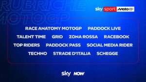 Per le rubriche, debutta “Techno”, che spiegherà la tecnica motociclistica. Nel corso della settimana, il giovedì si partirà sempre con Paddock Pass, per una visione completa sui temi della gara alle porte. A Racebook sarà invece affidato il racconto diretto dei piloti. I nuovi talenti del futuro saranno raccontati da Talent Time, mentre il presente e il passato delle corse sarà l’argomento di Top Riders. La vita dei piloti sarà osservata con un occhio scherzoso e leggero da Rosario Triolo nel suo Social Media Rider, uno sguardo privilegiato nei garage e dietro le quinte del Motomondiale. Nel race day della domenica l’avvicinamento alla gara sarà a cura di Grid, per respirare l’adrenalina direttamente dalla griglia di partenza a pochi minuti dall’inizio, mentre l’immediato post GP sarà a cura di Zona Rossa, con Vera Spadini e i suoi ospiti. Inoltre, sui circuiti europei torna il truck di Sky Sport, baricentro editoriale dell’attività in pista.