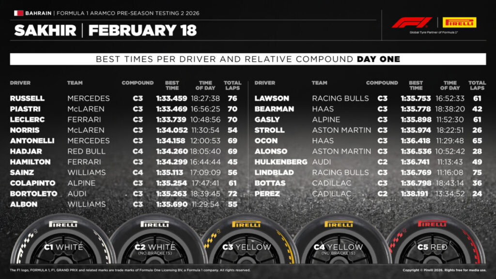 Migliorano ulteriormente i tempi sul giro nella prima giornata dei secondi test pre stagionali in Bahrain. A chiudere oggi in cima alla classifica è stato George Russell (Mercedes) con un crono di 1:33.459s, seguito da Oscar Piastri (McLaren) in 1:33.469s, esattamente due decimi più veloce del miglior tempo fatto segnare da Kimi Antonelli la scorsa settimana. Charles Leclerc (Ferrari) non è riuscito a raggiugere il tempo dell’australiano per +0.270s. I cinque migliori tempi di mercoledì sono stati ottenuti tutti con la mescola C3, in condizioni di pista molto simili a quelle dei precedenti tre giorni di test. A differenza della scorsa settimana, le squadre hanno potuto selezionare 24 set di gomme da asciutto dall’intera gamma Pirelli.