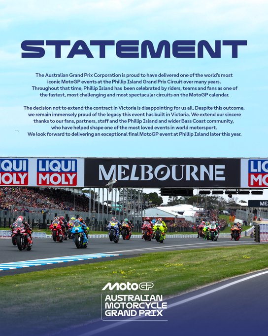 Dura la replica dell’Australian Grand Prix Corporation: “L’Australian Grand Prix Corporation è orgogliosa di aver organizzato uno degli eventi di MotoGP più iconici al mondo sul circuito di Phillip Island per molti anni. In tutto questo tempo, Phillip Island è stata celebrata da piloti, team e tifosi come uno dei circuiti più veloci, impegnativi e spettacolari del calendario MotoGP. La decisione di non prolungare il contratto a Victoria è deludente per tutti noi. Nonostante ciò, restiamo immensamente orgogliosi dell’eredità che questo evento ha rappresentato nello Stato di Victoria. Ringraziamo sinceramente i nostri tifosi, i nostri partner, il nostro staff e la comunità di Phillip Island e della Bass Coast in generale, che hanno contribuito a dare vita a uno degli eventi più amati del motorsport mondiale. Non vediamo l’ora di offrire un eccezionale ultimo evento a Phillip Island quest’anno“.