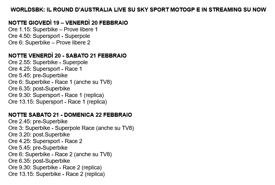 Tutto pronto per l’inizio della stagione WSBK 2026, in diretta esclusiva su Sky e in streaming su NOW, con TV8 che trasmetterà tutte le gare di Superbike in chiaro. Da questa notte a domenica 22 febbraio si scende in pista a Phillip Island per il primo dei 12 appuntamenti stagionali, il round d’Australia. Dopo le prime prove libere del weekend, sarà il momento della Superpole di SBK che scatta nella notte tra venerdì e sabato alle 2.55. Sabato mattina alle 6 si assegnano i primi punti della stagione con Gara 1, in programma alle 6. Nella notte tra sabato e domenica, alle 3, è tempo di Superpole Race, mentre domenica alle 6 si torna in pista per Gara 2. Nel weekend australiano primo appuntamento della stagione anche la WorldSSP.