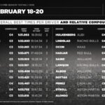 Questa settimana sono stati percorsi 20.693 chilometri, in prevalenza sulle C3 (61%), le mescole più utilizzate dai team anche nei primi tre giorni dei test pre-stagionali. Sono dunque 41.366 i chilometri percorsi in sei giorni dalle undici scuderie, più della lunghezza della circonferenza terrestre. I set di pneumatici slick usati da mercoledì sono 326 che sommati a quelli della prima tranche di test raggiungono 591 set totali.