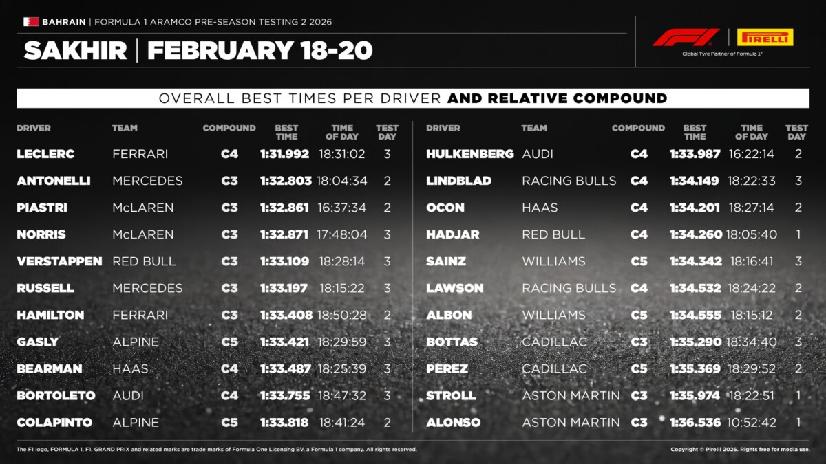 È arrivato nell’ultima ora dei sei giorni di test pre-stagione in Bahrain il miglior tempo assoluto sul circuito di Sakhir con i nuovi pneumatici Pirelli. Charles Leclerc ha infatti migliorato di 8 decimi il riferimento fatto segnare ieri da Kimi Antonelli, chiudendo questa lunga sessione di due settimane con un 1:31.992s ottenuto su C4.