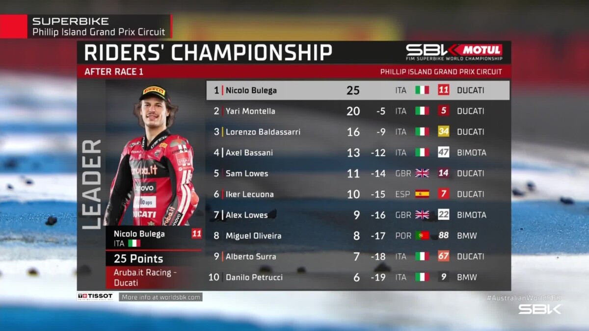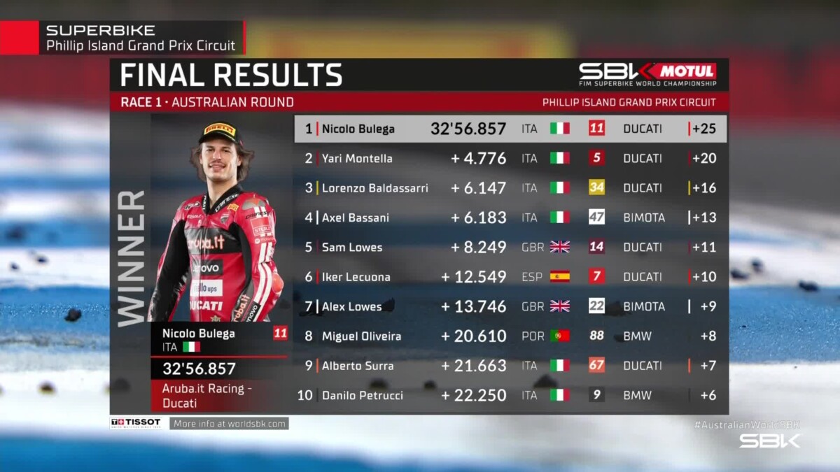 Una gara condotta dalla prima all’ultima curva per Bulega che conferma il feeling straordinario sul circuito australiano dove lo scorso anno è stato protagonista di una fantastica tripletta. Lecuona non riesce a trovare le condizioni per esprimersi al meglio in Superpole ed è costretto a partire dalla tredicesima posizione. Il pilota spagnolo è protagonista però di una gara estremamente solida che si traduce in una bella rimonta che gli consente di chiudere al sesto posto.
