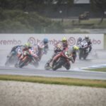 In Gara 2 lo scenario cambia completamente; pista bagnata, vento forte e 22 giri da affrontare in condizioni wet. Montella scatta bene e si inserisce subito nel gruppo di testa, salendo prima terzo e poi secondo, alle spalle del leader Bulega. Con un passo costante sull’1:40 alto, consolida la posizione mantenendo il controllo sugli inseguitori. Bautista, partito settimo, perde inizialmente qualche posizione ma resta agganciato al gruppo. Giro dopo giro aumenta il ritmo, supera Mackenzie e Alex Lowes e si porta in quarta posizione, entrando nella lotta per il podio. Al sedicesimo giro arriva però il colpo di scena. Yari Montella, saldamente secondo, perde il posteriore in Curva 9 ed è costretto al ritiro. Bautista eredita così la terza posizione e negli ultimi giri gestisce con lucidità il margine sugli avversari, tagliando il traguardo sul terzo gradino del podio.