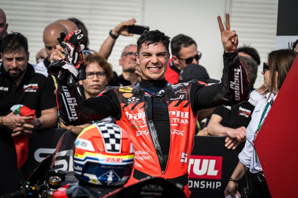 Nella Superpole Race, sulla distanza di 10 giri, Montella parte dalla seconda posizione e scatta in modo impeccabile, prendendosi la leadership già in Curva 1. Bautista, dodicesimo in griglia, recupera subito terreno iniziando un’ottima rimonta. Il gruppo di testa resta racchiuso, con i primi sei costantemente in bagarre. Montella impone un ritmo competitivo, con un buon ritmo gara e difendendo la prima posizione dagli attacchi di Bulega e dei fratelli Lowes. Il confronto si accende giro dopo giro, con sorpassi ravvicinati e distacchi minimi. Bautista nel frattempo risale progressivamente fino alla settima posizione, restando agganciato al gruppo immediatamente alle spalle dei primi. Con il passare dei giri vengono segnalate nuove gocce e la pista diventa sempre più delicata. Il numero #5 perde la leadership, ma resta stabilmente nel gruppo di testa, lottando ruota a ruota per il podio fino all’ultimo passaggio. L’arrivo è quindi in volata con Yari che chiude quarto, miglior pilota indipendente, per appena 18 millesimi di secondo, al termine di una gara tiratissima. Bautista completa la rimonta chiudendo settimo, un’ottima rimonta rispetto alla posizione di partenza.