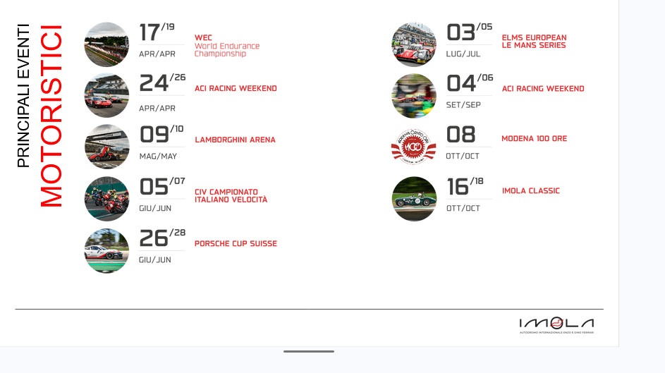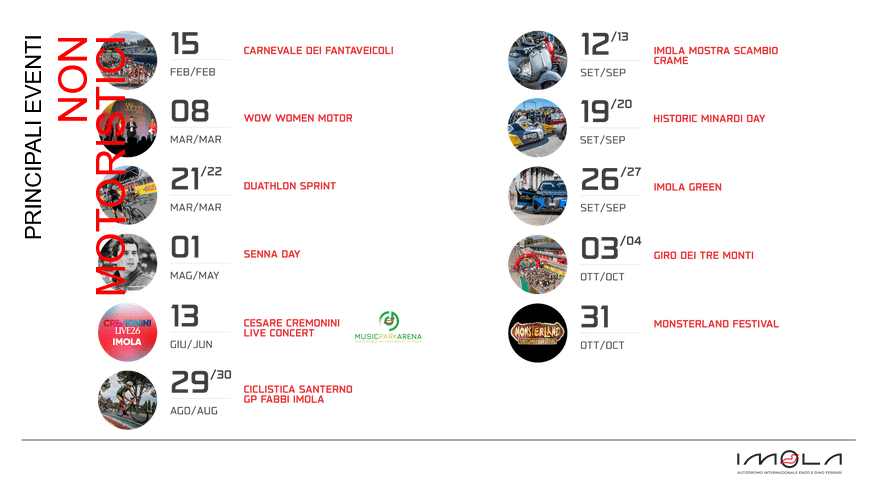 Senza dimenticare eventi non motoristici di caratura nazionale come il campionato italiano Duathlon Sprint, il Giro dei Tre Monti podistico e il GP Fabbi Imola riservato al ciclismo giovanile. Sono inoltre previste 58 giornate di apertura al pubblico, dove sarà possibile percorrere il tracciato a piedi o in bicicletta, confermando l’Autodromo come spazio vissuto e condiviso dalla cittadinanza. La stagione 2026 rappresenta così un equilibrio tra competizione, spettacolo, heritage, sostenibilità, cultura e innovazione. L’Autodromo si conferma non solo teatro di grandi sfide sportive, ma infrastruttura viva e attiva durante tutto l’anno, capace di generare valore economico, sociale, formativo e culturale per la città di Imola e per l’intero territorio, rafforzando il posizionamento della Motor Valley e del Made in Italy nel panorama internazionale.