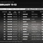 Nella seconda settimana sono stati percorsi 20.693 chilometri, in prevalenza sulle C3 (61%), le mescole più utilizzate dai team anche nei primi tre giorni dei test pre-stagionali. Sono dunque 41.366 i chilometri percorsi in sei giorni dalle undici scuderie, più della lunghezza della circonferenza terrestre. I set di pneumatici slick usati negli ultimi tre giorni sono stati 326 che sommati a quelli della prima tranche di test raggiungono 591 set totali.