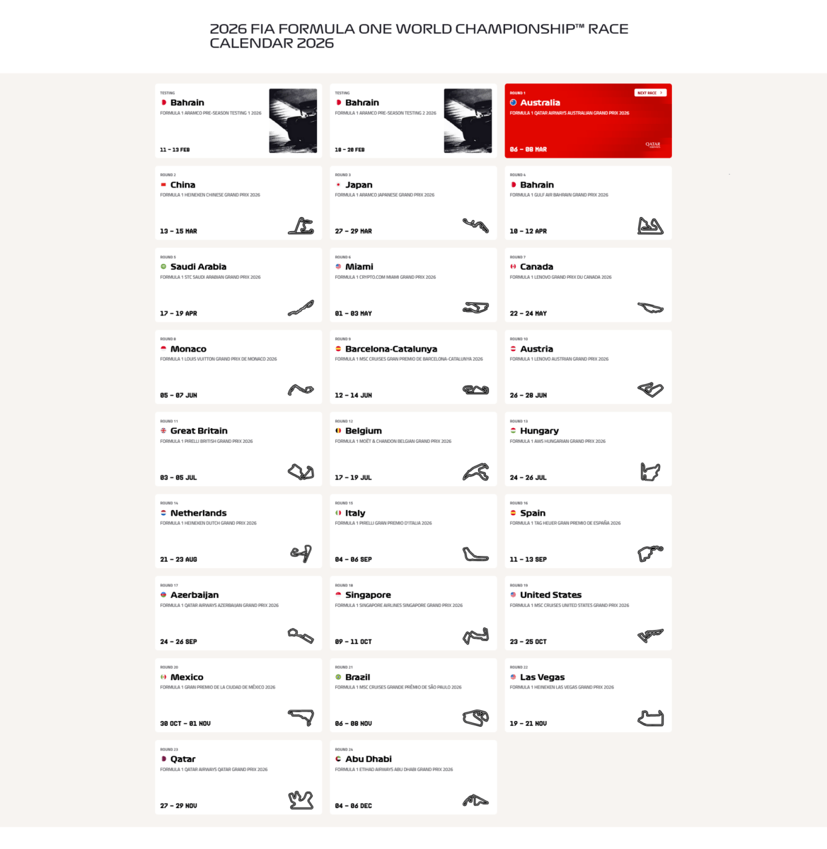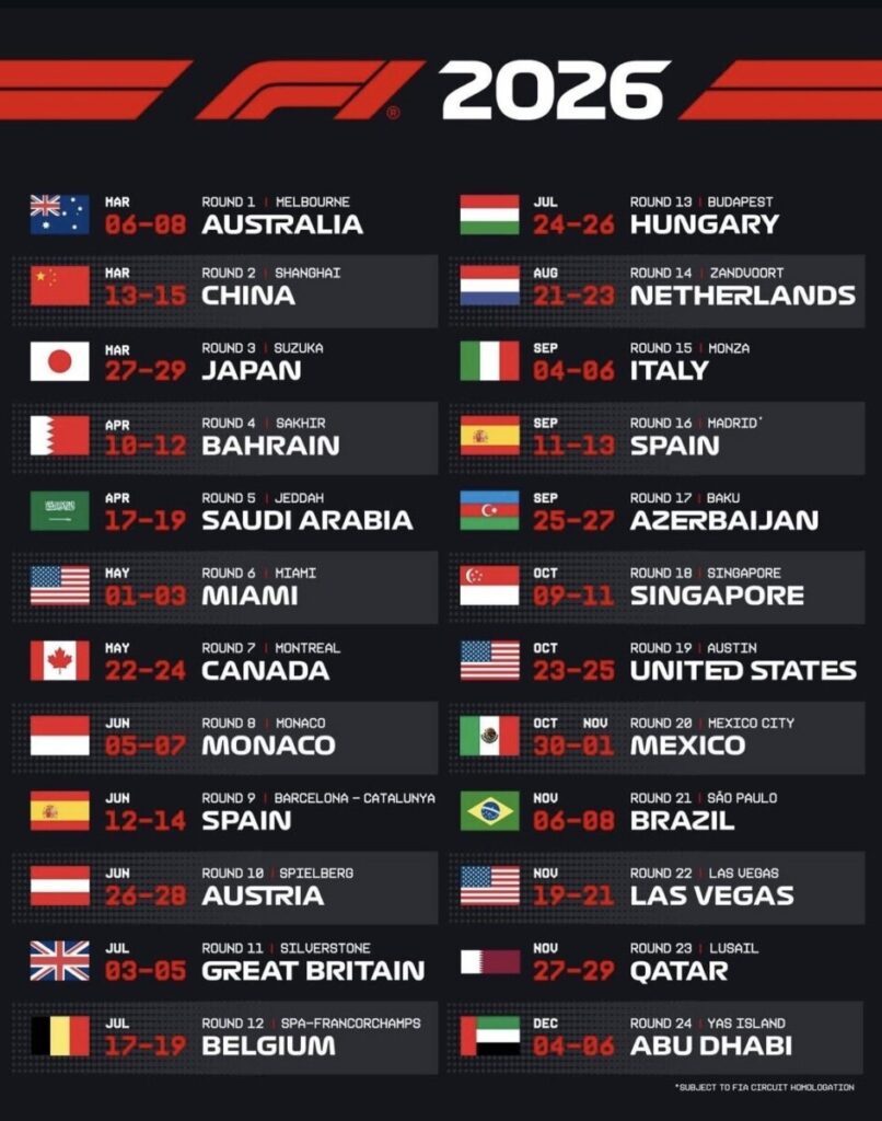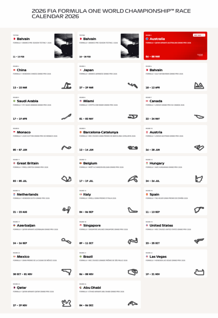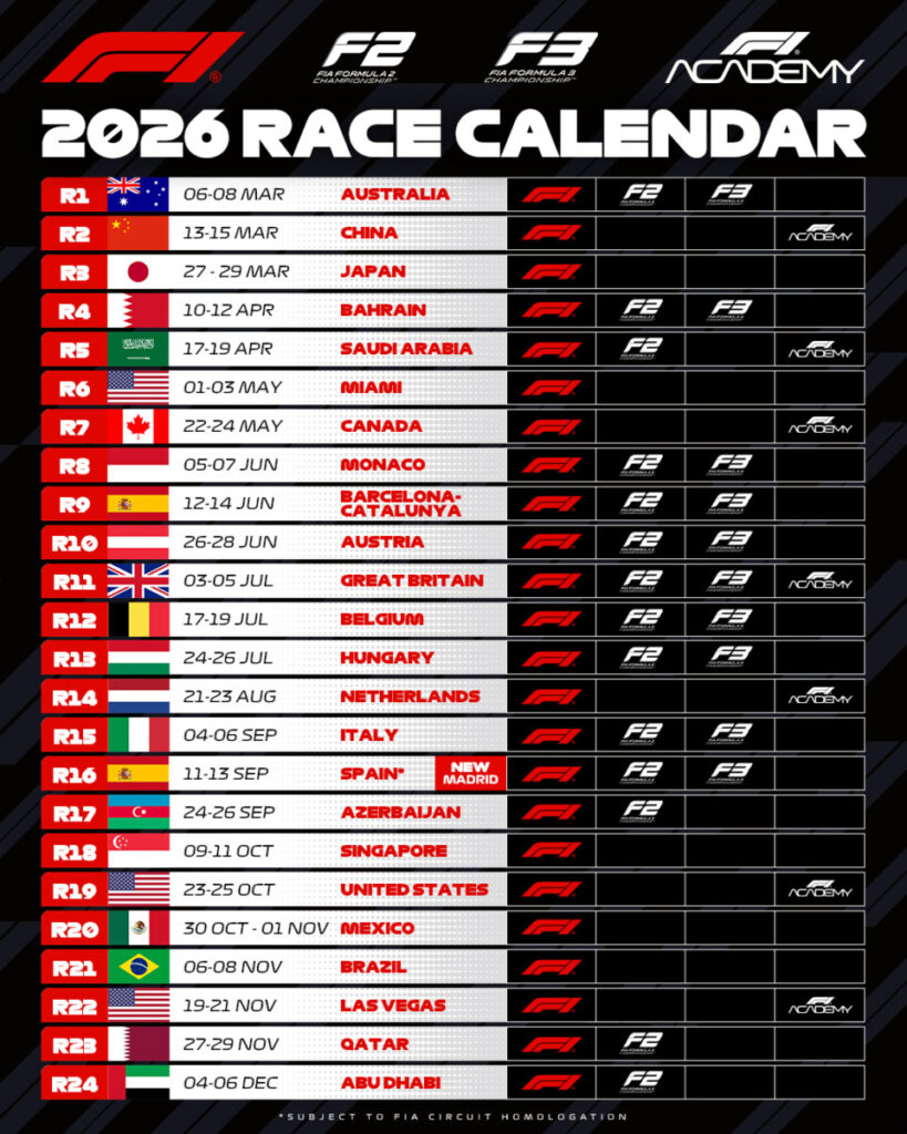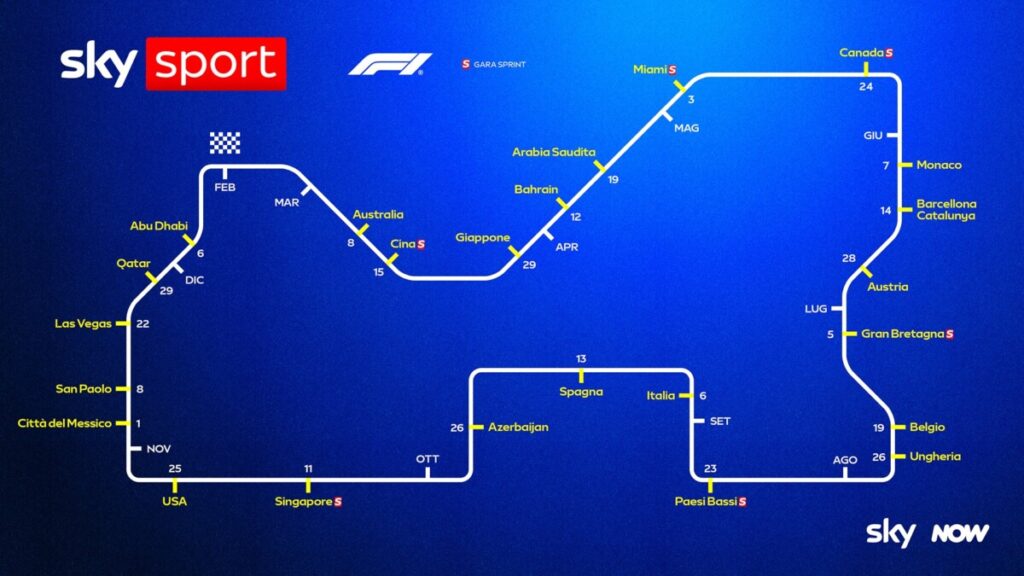 Anche nel 2026 tutto il campionato del mondo di Formula 1 sarà in diretta su Sky e NOW. Saranno 24 le gare tra Europa, Asia, Oceania, Nord e Sud America, con il tradizionale finale di Abu Dhabi il 6 dicembre, che assegnerà i titoli piloti e costruttori. Appuntamento tricolore il weekennd del 6 settembre per il GP d’Italia a Monza, in diretta anche su TV8. Sempre live in chiaro anche le 6 gare Sprint di Cina, USA-Miami, Canada, Gran Bretagna, Olanda e Singapore, con le relative qualifiche. A Melbourne nuovo inizio anche per la Formula 2 (14 weekend di gara) e per la Formula 3 (10 appuntamenti in totale), mentre bisognerà attendere Shanghai per l’esordio della F1 Academy (7 fine settimana). In primavera, invece, sarà la volta della Porsche Mobil 1 SuperCup (8 round totali).
