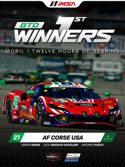Alla 12 Ore di Sebring – seconda prova dell’IMSA SportsCar Championship e dell’IMSA Endurance Cup – la Ferrari ha conquistato la prima storica vittoria della nuova 296 GT3 Evo grazie al successo ottenuto da AF Corse USA nella classe GTD con i piloti ufficiali Antonio Fuoco e Lilou Wadoux, affiancati da Simon Mann. In GTD Pro, invece, il miglior risultato per le vetture della Casa di Maranello è il settimo posto ottenuto dal team Triarsi Competizione.