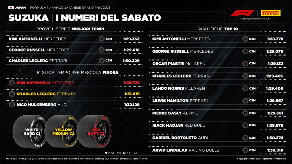 A poco meno di due settimane dalla sua prima vittoria in un Gran Premio in Cina, Kimi Antonelli ha conquistato oggi la pole position in Giappone. George Russell ha poi assicurato che anche la seconda Mercedes parta dalla prima fila nella gara di domenica, chiudendo al secondo posto. Alle spalle dei due, Oscar Piastri ha fatto segnare il terzo miglior tempo e partirà dunque dalla P3 domani.