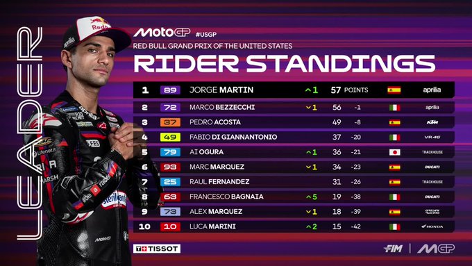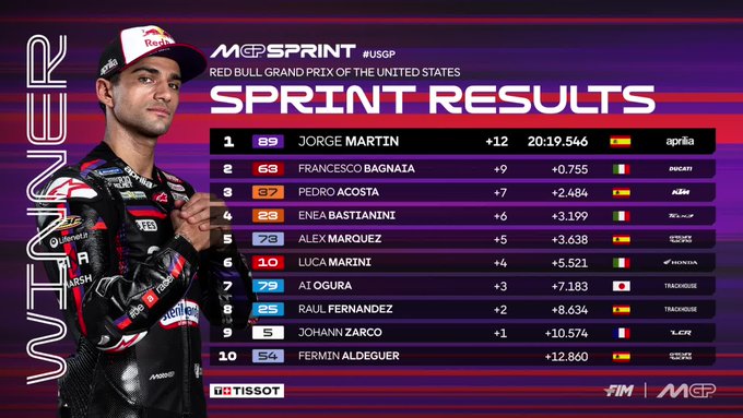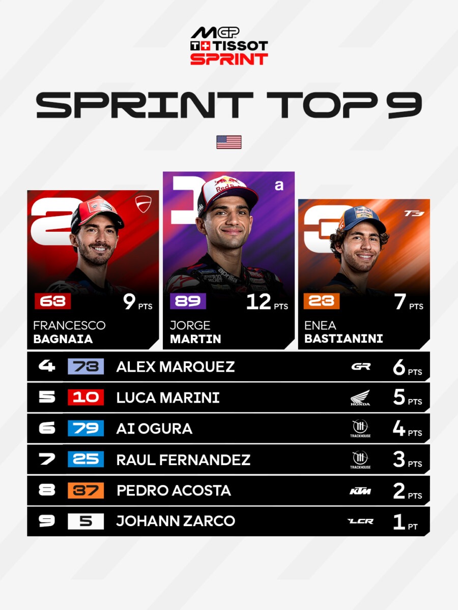 Sul podio con Martin sono quindi finiti Bagnaia e Acosta, seguiti da Enea Bastianini (Red Bull KTM Tech3), Alex Marquez (BK8 Gresini Racing MotoGP), Luca Marini (Honda HRC Castrol), Ai Ogura (Trackhouse MotoGP Team), il compagno di squadra Raul Fernandez e Johann Zarco (Castrol Honda LCR), tutti a punti. La gara domani alle 22 ora italiana. Marco Bezzecchi e Luca Marini dovranno scontare una penalità di 2 posizioni per aver ostacolato Marc Marquez in qualifica.