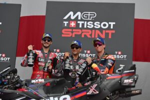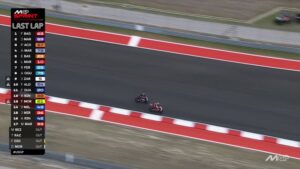 Il secondo giro iniziava con Bagnaia davanti ad Acosta e Joan Mir (Honda HRC Castrol), che col passare dei giri subiva però il recupero della coppia Aprilia Racing formata da Martin e Bezzecchi, fuori dalla top 5 in avvio. Al quarto passaggio il numero 89 ha superato sia Mir che Acosta. Si è portanto in seconda posizione dietro a Bagnaia, che aveva però oltre un secondo di vantaggio. Lo spagnolo aveva un asso nella manica. Anzi, una grande risorsa nella gomma posteriore, essendo l’unico della griglia a scegliere la mescola media e non morbida. Col passare dei giri, dunque, sapeva di poter contare su un vantaggio. Ma al sesto ha subito l’attacco di Bezzecchi, poi un errore l’ha fatto finire a terra. Ereditata la seconda piazza, Martin ha recuperato metri su metri. Nell’ultimo giro si è portato in scia al leader. E alla curva 11, dove Marquez e Di Giannantonio erano usciti di scena, ha attaccato mettendo a segno il colpo.