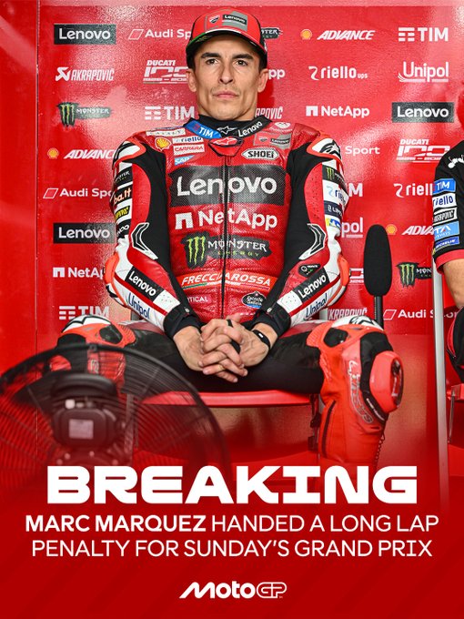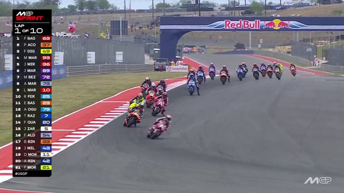 Al via, al comando Francesco Bagnaia (Ducati Lenovo Team), seguito da Pedro Acosta (Red Bull KTM Factory Racing), Marc Marquez (Ducati Lenovo Team) e il poleman Fabio Di Giannantonio (Pertamina Enduro VR46 Raving Team), subito autore di un’entrata aggressiva sul campione del mondo in carica per il terzo posto. Il numero 93, che ad Austin ha già vinto sette GP, non ha digerito la mossa. Alla curva 11 si è infilato all’interno, costringendo il rivale a rialzare la moto per evitare il contatto. Ma ha perso l’anteriore e travolto il compagno di marca. Per Marquez i commissari hanno deciso un long lap penalty nella gara di domani.