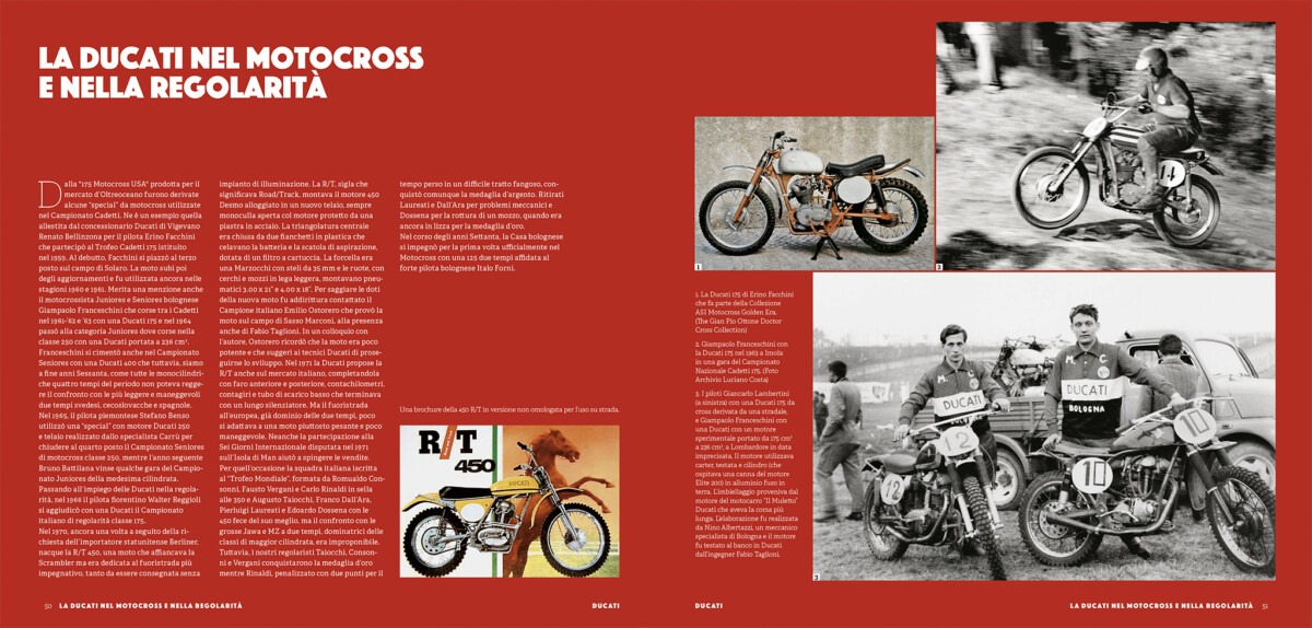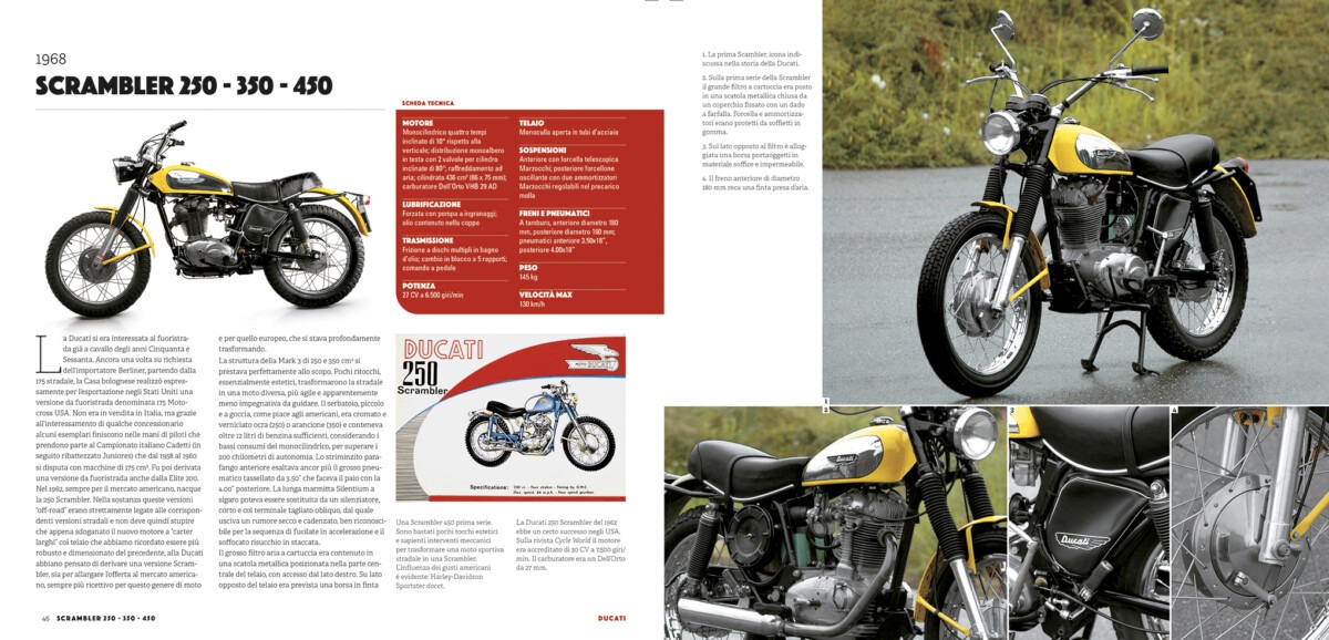 utto iniziò con un motore ausiliario da applicare alla bicicletta, il Cucciolo. È con questo semplice ma importante “accessorio” che il nome Ducati entrò nel mondo delle due ruote. Quello stesso Marchio lo ritroviamo oggi sulla Desmosedici GP che da tempo domina la massima formula del motociclismo sportivo, la MotoGP. Tra questi due estremi si colloca una produzione basata su diverse architetture tecniche e stilistiche, sulle quali spicca il sistema desmodromico di comando delle valvole, opera dell’ingegner Fabio Taglioni. Da esclusività tecnica dedicata ai motori da corsa, il “desmo” è arrivato alla produzione di serie negli anni Sessanta, sul leggendario monocilindrico monoalbero. Poi sono venute le bicilindriche “a L”, la storica vittoria alla 200 Miglia di Imola, la serie delle Pantah e infine il salto generazionale con il bicilindrico “a L” quattro valvole raffreddato a liquido: il Desmoquattro. Un altro pilastro che ha dato l’avvio all’era moderna della Ducati, densa di vittorie in pista, con la fenomenale Desmosedici, e sul mercato con prodotti come la Monster, divenuti leggendari. Questo volume raccoglie e passa in rassegna i principali modelli che hanno fatto la storia della Casa bolognese, dedicando a ognuno specifiche schede con testi di inquadramento, dati tecnici e un ricco repertorio iconografico.