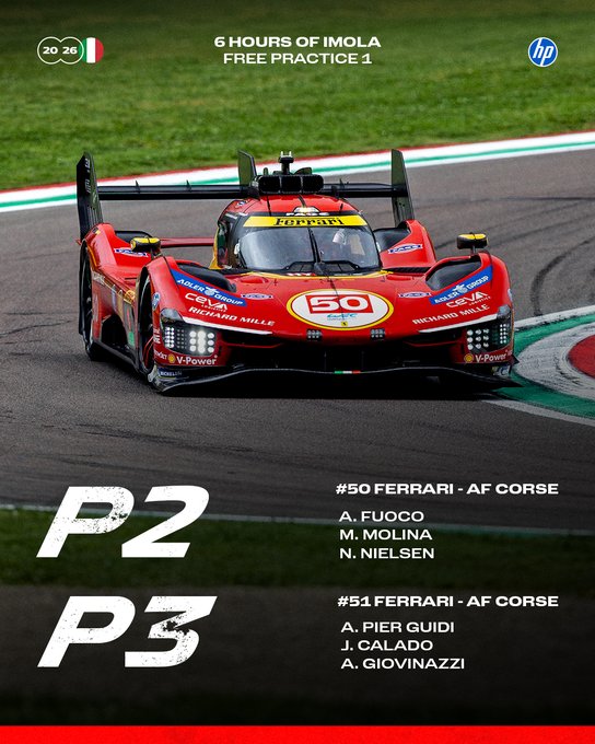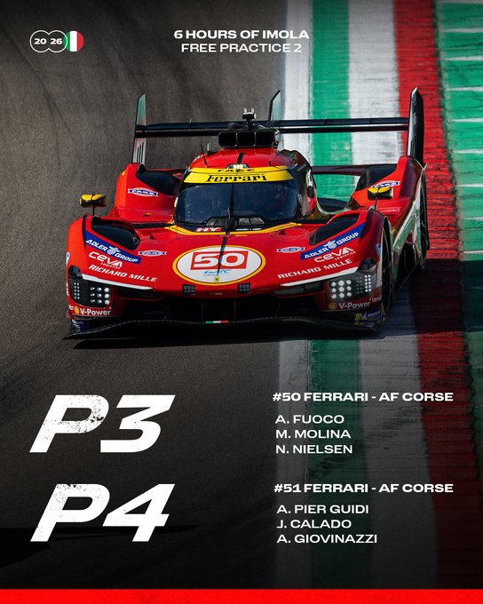 Dopo il Prologo di martedì, l’Autodromo Internazionale Enzo e Dino Ferrari di Imola ha ospitato nella giornata di venerdì 17 aprile le due sessioni di prove libere che hanno aperto ufficialmente le attività del primo round del campionato FIA WEC. Al termine del primo turno di un’ora e trenta minuti, partito alle 9.30 del mattino, le tre Ferrari 499P impegnate in questo primo appuntamento stagionale sono risultate le più veloci, andando ad occupare le prime tre posizioni, con la numero 83 a siglare il miglior tempo. Nella seconda sessione pomeridiana, iniziata alle 15.15 la più veloce delle vetture della Casa di Maranello è risultata la numero 50, con il terzo riscontro cronometrico.