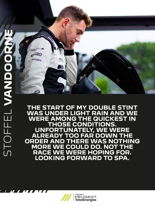 La PEUGEOT 9X8 #93 ha avuto un inizio di gara ben diverso. Partendo dalla 15ª posizione in griglia, Paul Di Resta ha guadagnato una posizione al primo giro e un’altra dopo il primo pit stop. La vettura numero 93 si trovava in 12ª posizione dopo due ore di gara quando Nick Cassidy, a causa delle gomme fredde, è andato in testacoda all’uscita dai box. La vettura è scivolata in 16ª posizione prima che Stoffel Vandoorne prendesse il volante per un ultimo doppio stint con gomme morbide. A seguito di prestazioni contrastanti in qualifica, il team ha optato per strategie di gara diverse per ciascuna vettura, con l’obiettivo di consolidare la posizione della numero 94 e al contempo permettere alla numero 93 di risalire la classifica. In una gara in cui i momenti chiave non sono andati per il verso giusto, il team rimane pienamente impegnato e concentrato sul seguito della stagione. La prossima tappa del Campionato si svolgerà sabato 9 maggio sull’iconico circuito di Spa-Francorchamps.