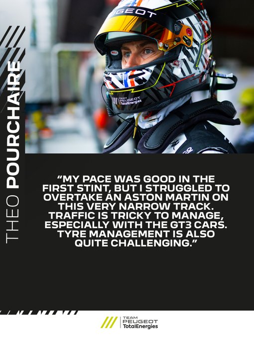 Partendo dalla quarta posizione in griglia, la PEUGEOT 9X8 #94 ha perso due posizioni al via e altre quattro dopo il primo pit stop. Loïc Duval si trovava in decima posizione quando ha ceduto il volante a Théo Pourchaire dopo un doppio stint con pneumatici medi. Il francese, sempre su gomme medie, è risalito fino alla settima posizione prima di passare il volante a Malthe Jakobsen. Il danese ha poi lottato duramente fino al traguardo, concludendo infine in dodicesima posizione.