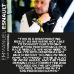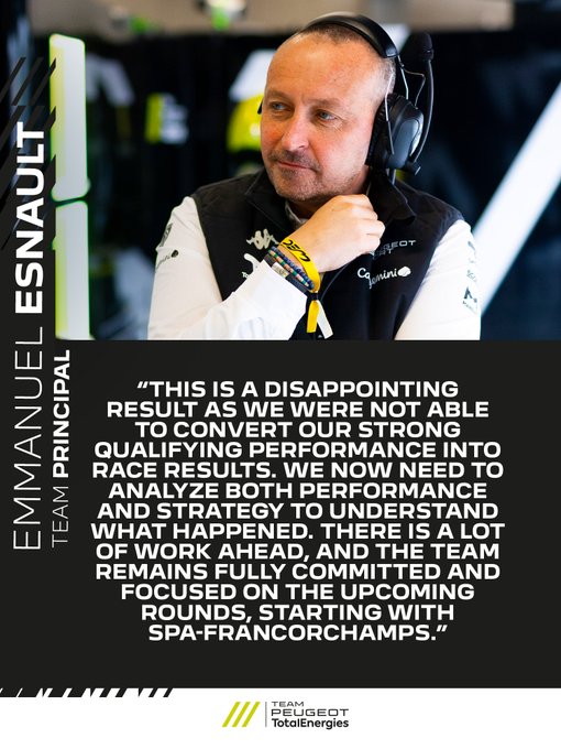 Emmanuel Esnault, Team Principal: “È un risultato deludente, perché non siamo riusciti a trasformare l’ottima prestazione in qualifica in risultati in gara. Ora dobbiamo analizzare sia le prestazioni sia la strategia per capire cosa è successo. C’è molto lavoro da fare e il team rimane pienamente impegnato e concentrato sulle prossime gare, a partire da Spa-Francorchamps”.