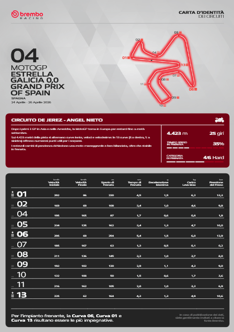 Secondo gli ingegneri Brembo che per l’11° anno di fila lavorano a stretto contatto con tutti i team della MotoGP, il Circuito de Jerez Angel Nieto da 4,423 km di lunghezza rientra nella categoria dei circuiti altamente impegnativi per i freni. In una scala da 1 a 6 si è meritato un indice di difficoltà di 4 grazie alle 11 frenate al giro per complessivi 33 secondi e mezzo, pari al 35% della gara. Tre frenate sono della categoria High, 4 sono Medium e altrettante Light. Le decelerazioni variano da 0,5 a 1,5 g a seconda delle curve.