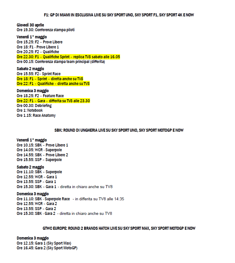 Finalmente, dopo la lunga pausa, nel weekend riparte la F1 con il GP di Miami, cui si aggiungono la WorldSBK, il GTWC e le produzioni originali di Sky Sport.