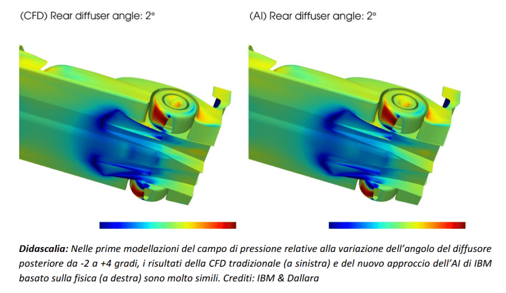 IBM e Dallara utilizzano l’AI per accelerare questi flussi di progettazione senza sostituire la fisica sottostante. In un primo esempio, che si basa sulla geometria di una vettura da corsa concettuale simile ad un prototipo Le Mans (LMP2), le due aziende hanno confrontato analisi CFD di diverse configurazioni del diffusore posteriore — un componente situato sotto la parte posteriore dell’auto, che contribuisce a generare un efficiente carico aerodinamico massimando l’aderenza della vettura alla pista — con i risultati ottenuti mediante il nuovo metodo di AI basato sulla fisica.