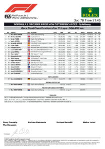 Sainz, Hamilton, Pierre Gasly, Alex Albon, Esteban Ocon, Logan Sargeant, Nyck de Vries e Yuki Tsunoda hanno quindi avuto ulteriori penalità. Lo spagnolo della Ferrari passa da P4 a P6, con Norris promosso in P4 e Fernando Alonso in P5. Hamilton scende da P7 a P8, con George Russell promosso a P7. Gasly perde una posizione ed è P10, con Lance Stroll che sale in P9, e Ocon scende da P12 a P14. Albon e Sargeant mantengono i rispettivi P11 e P13. De Vries scende da P15 a P17, mentre Tsunoda passa da P18 a P19. Se non è una buffonata questa diteci voi cos’è… 83 giri cancellati, sembrerebbe una barzelletta ma è la tragica realtà. Uno sport sempre più allo sbando… E poi vogliono che la gente paghi per vedere una gara il cui risultato qualche ora dopo cambia, per via di stupidi track limits di pochi centimetri, con piloti che rischiano la vita e squadre che lavorano e investono come pazzi per migliorare. In un weekend in cui è anche morto un ragazzo di 18 anni a Spa, una cosa su cui la FIA dovrebbe spendere energie, anziché sprecarle esaminando immagini col metro in mano. Sotto il documento FIA e le classifiche finali. Sperando che a qualcuno non venga in mente qualche altra idea brillante,