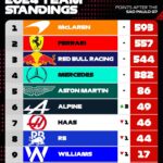 Giornata da sogno per l’Alpine, con Ocon e Gasly che sono riusciti a portare a casa un doppio podio, per cui il team passa dalla nona alla sesta posizione nel Costruttori. Quarta posizione per Russell davanti a Charles Leclerc, con Norris 6° in una gara assolutamente deludente e in cui perde terreno – e ogni speranza – nei confronti del leader del campionato. Settima la McLaren di Oscar Piastri, che scivola però all’ottavo posto per la penalità di 10 secondi per una collisione con Lawson. Promosso in 7° posizione Yuki Tsunoda, con doppio arrivo a punti per la RB, con Lawson nono. Punto finale a Lewis Hamilton – protagonista di giornata dopo aver regalato emozioni a tutti girando con la McLaren di Senna – che è riuscito a resistere agli attacchi finali di Sergio Perez, 11°.