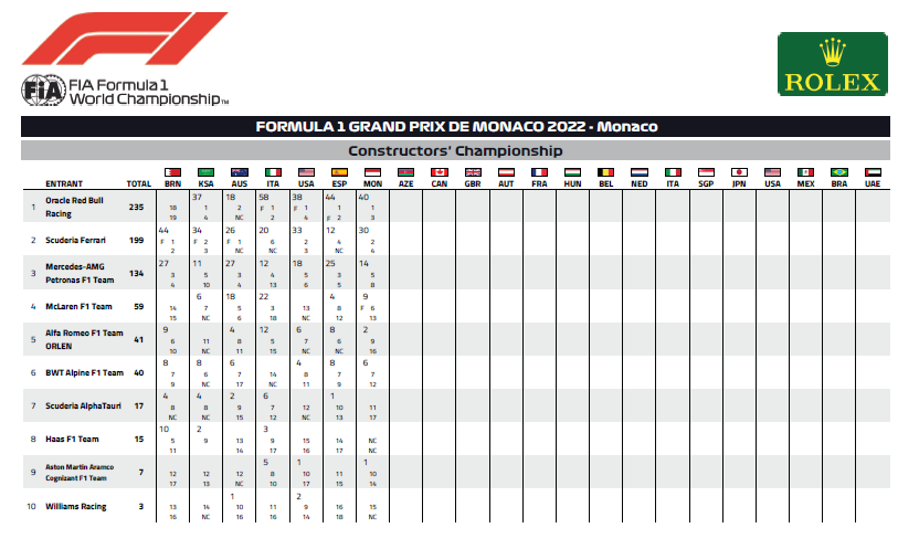 Passato direttamente dalle wet alle slick, George Russell ha chiuso 5°, davanti alla McLaren di Lando Norris. Partito 7°, Fernando Alonso ha chiuso nella stessa posizione con la sua Alpine, davanti alla Mercedes di Lewis Hamilton, che ha tentato di tutto per passarlo, ma invano. Per il sette volte campione un danno nella prima fase di gara, in un contatto con l’Alpine di Esteban Ocon, cui è stata data una penalità di 5 secondi e dalla 9° posizione scende quindi in 12°, con l’Alfa Romeo di Valtteri Bottas promossa in P9 e l’ultimo punto all’Aston Martin di Sebastian Vettel. Pierre Gasly ha chiuso 12°, ma promosso all’11° grazie alla penalità di Ocon. Deludente anche in questa gara Daniel Ricciardo, 13° davanti all’Aston Martin di Lance Stroll. Diciassettesimo e ultimo Yuki Tsunoda dietro l’Alfa Romeo di Zhou Guanyu e la Williams di Nicholas Latifi, 15°. Tre i ritiri: Kevin Magnussen, Mick Schumacher e Alex Albon.