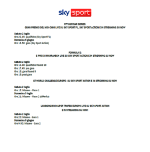 In arrivo su Sky e in streaming su NOW un altro fine settimana all’insegna del motorsport, con 6 appuntamenti in pista, a partire dalla F1. Fino a domenica 3 luglio, tutti a Silverstone per il GP di Gran Bretagna, in diretta esclusiva su Sky e in streaming NOW. Gara in onda domenica 3 luglio dalle 16, su Sky Sport F1, Sky Sport Uno e Sky Sport 4K – differita su TV8 dalle 19. Nello stesso weekend, da non perdere anche gli appuntamenti con la W Series, la NTT IndyCar Series con il GP del Mid-Ohio, la Formula E da Marrakech e il doppio appuntamento di Misano con il GT World Challenge Europe e il Lamborghini Super Trofeo Europa.