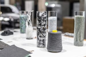 In abitacolo, i riciclati sono destinati principalmente ai rivestimenti insonorizzanti e antivibranti. I Pacchetti Interni permettono di scegliere tra finiture in pelle oppure di optare per la combinazione di similpelle e microfibra Dinamica. Quest’ultima simile visivamente e al tatto alla pelle scamosciata, ma in ampia parte (45%) realizzata mediante poliestere riciclato ricavato dalle bottiglie in PET. Il materiale ottenuto dal riutilizzo può contare sugli stessi standard qualitativi, estetici e tattili del tessuto classico. Per il rivestimento di un sedile di Audi Q4 e-tron vengono riciclate 26 bottiglie di plastica da 1,5 litri; 45 bottiglie per Audi A3.